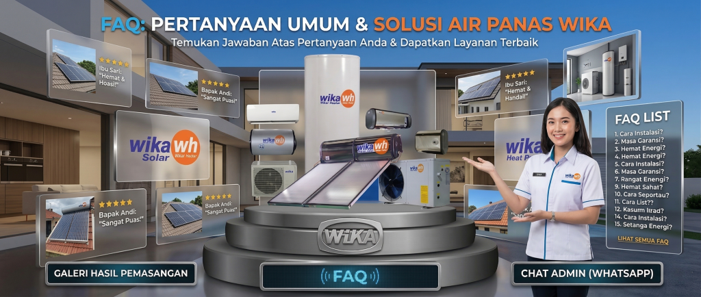 Garansi bervariasi tergantung tipe unit, biasanya mencakup garansi tanki hingga 7 tahun dan garansi komponen lainnya sesuai dengan ketentuan kartu garansi resmi WIKA.